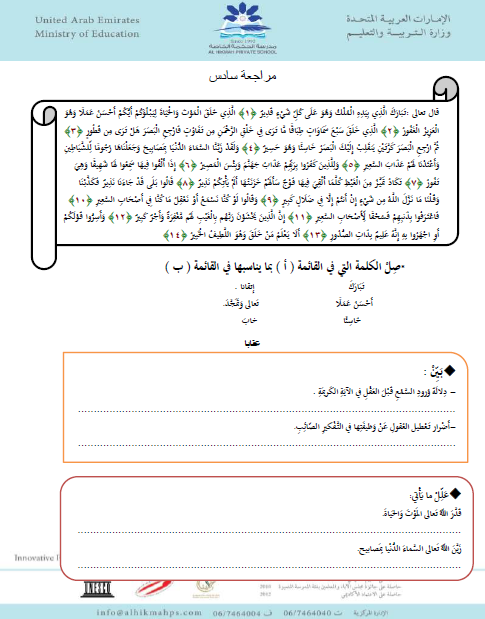 ورقة عمل لماده اللغه العربيه للصف السادس الفصل الثاني لتحميل الملف PDF اضغط هنا وتابع