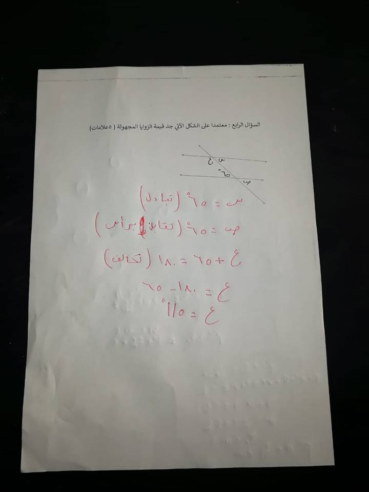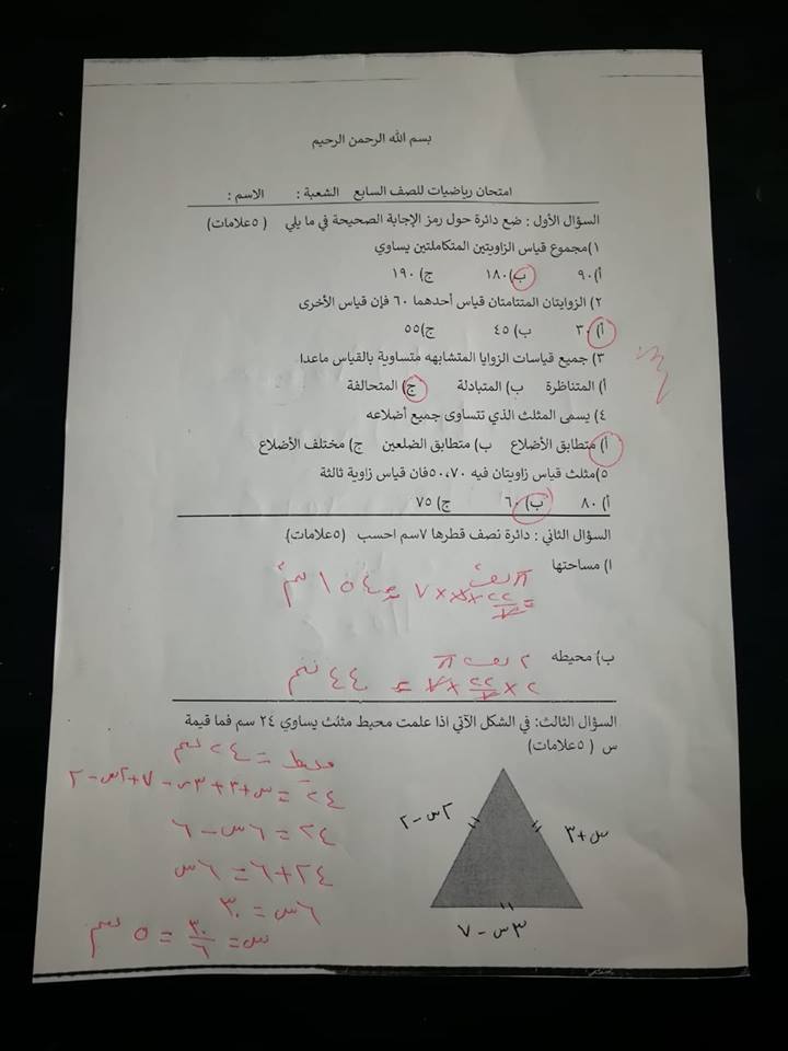 نموذج :اختبار الشهر الثاني لمادة الرياضيات للصف السابع الفصل الثاني