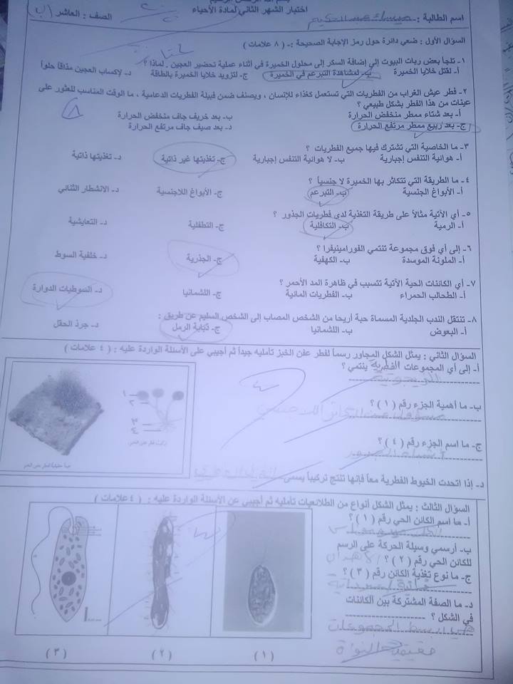 بالصور:نموذج لاختبار الشهر الثاني لمادة الأحياء للصف العاشر الفصل الثاني