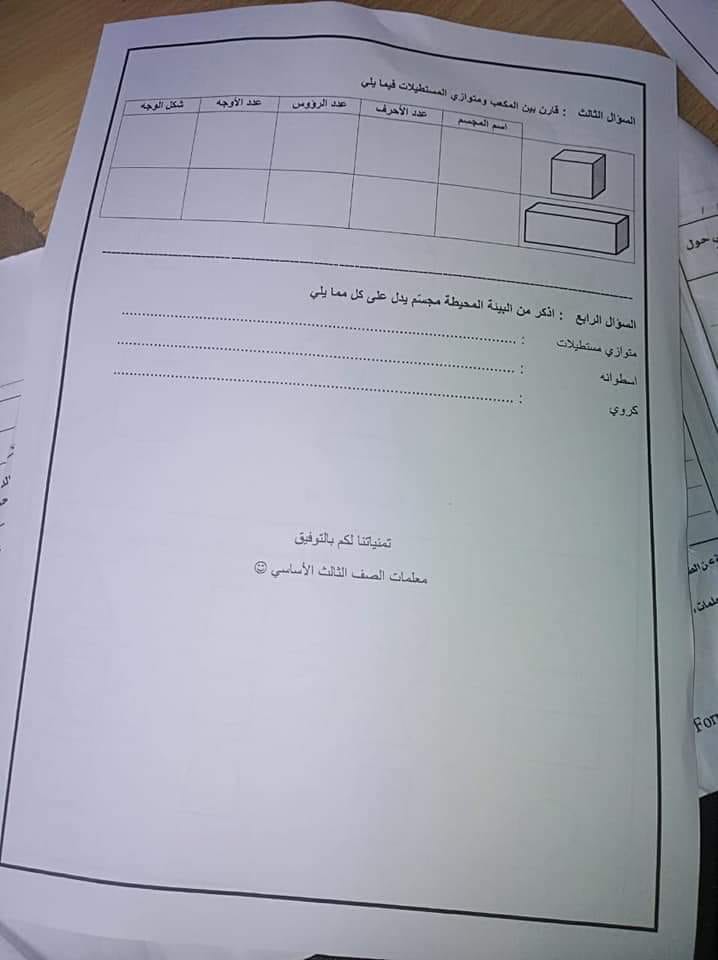 نموذج لاختبار الشهر الثالث لمادة الرياضيات للصف الثالث الفصل الثالث 2019