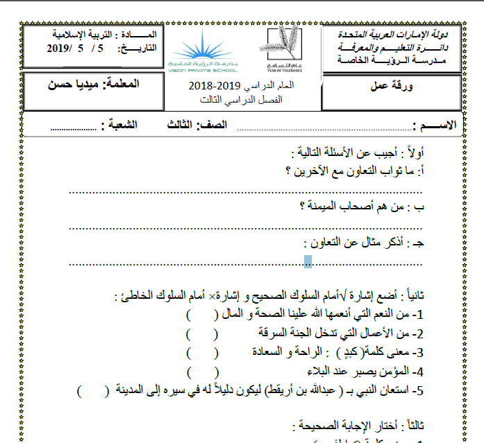 ورقة عمل اول ثلاث دروس لمادة التربية الاسلامية الصف الثالث الفصل الثالث لتحميل الملف PDF اضغط هنا وتابع
