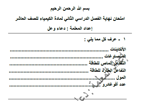امتحان لمادة كمياء للصف العاشر نهاية الفصل الدراسي الثاني 2019