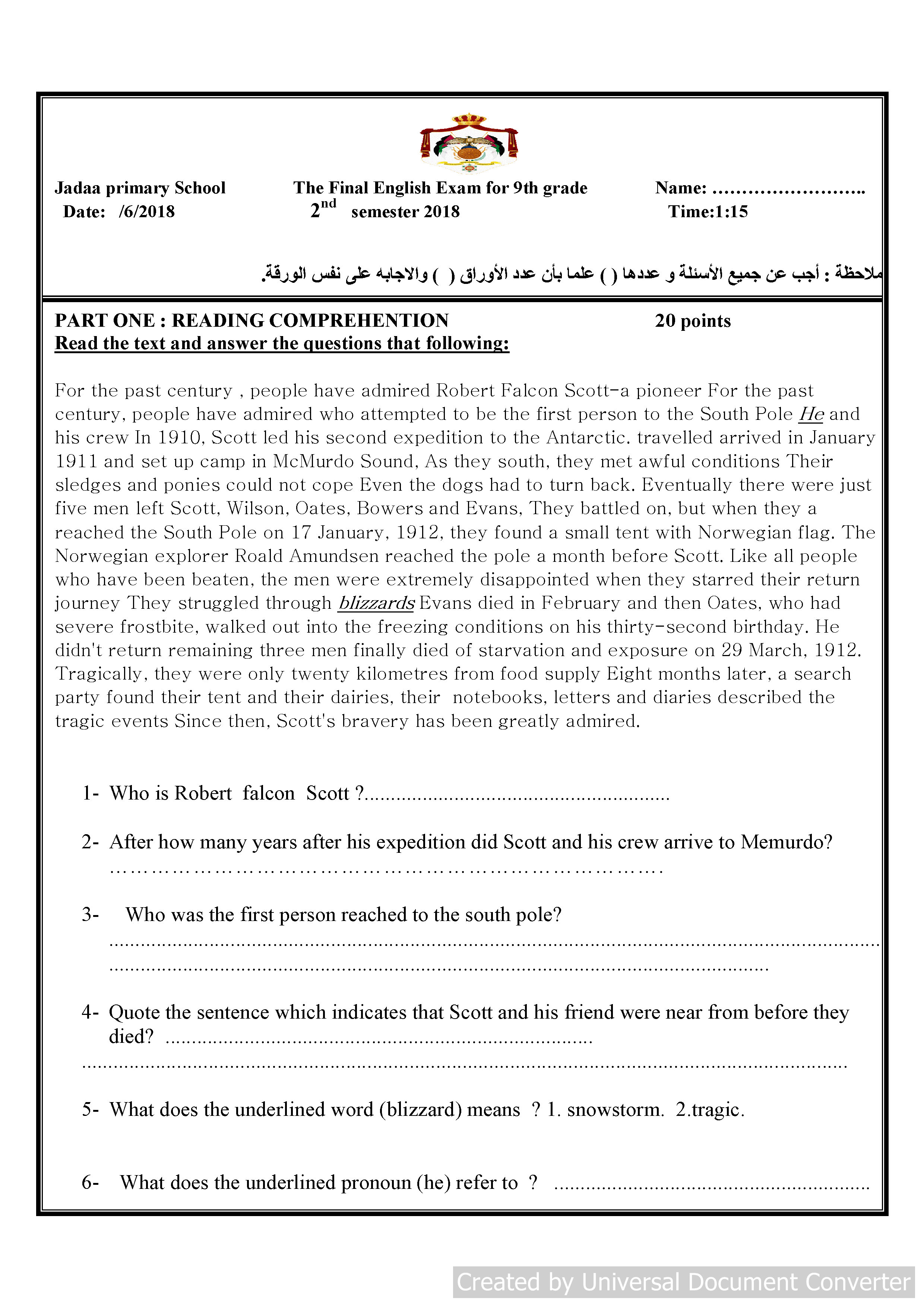 بالصور + نموذج wordالاختبار النهائي لمادة اللغة الإنجليزية للصف التاسع الفصل الثاني