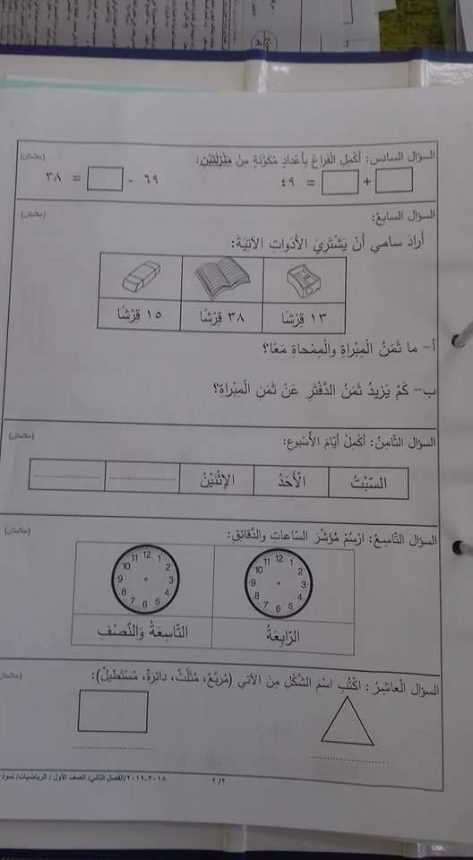 نماذج الوكالة A-B: الاختبار النهائي لمادة الرياضيات للصف الأول الفصل الثاني2019