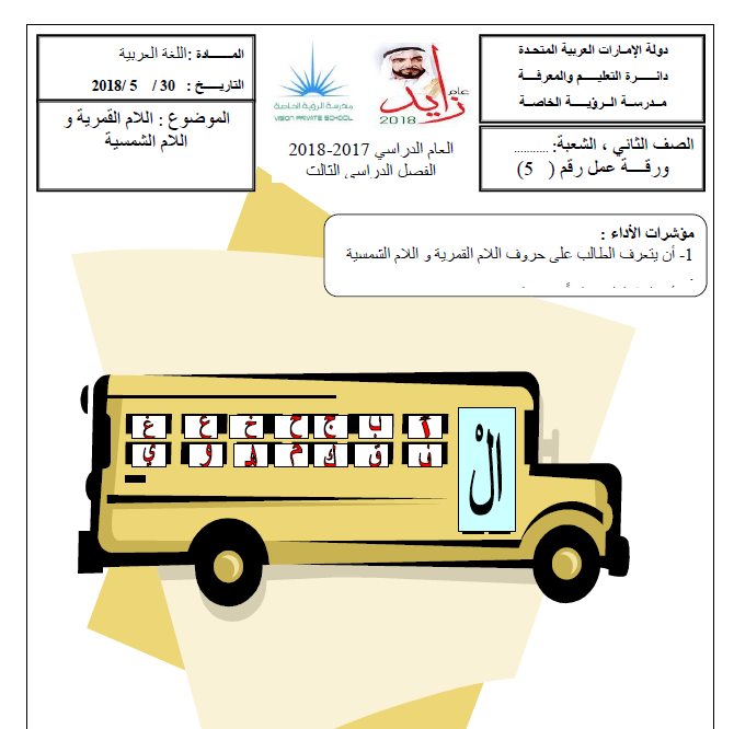 ورقة عمل اللام الشمسية واللام القمرية لمادة اللغة العربية للصف الثاني الفصل الثالث