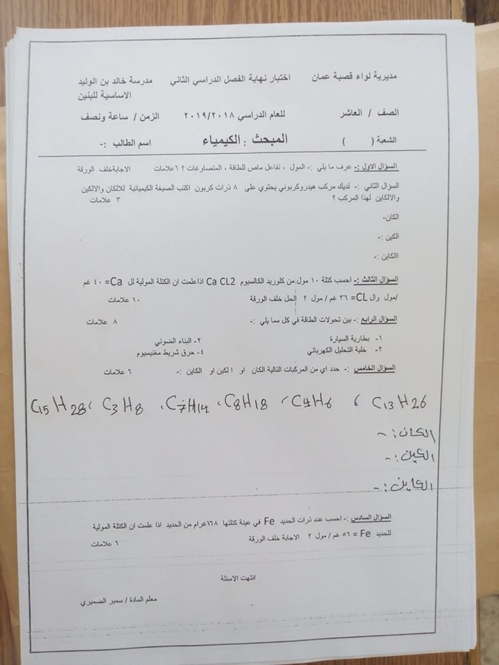 نموذج الاختبار النهائي لمادلعة الكيماء للصف العاشر الفصل الثاني
