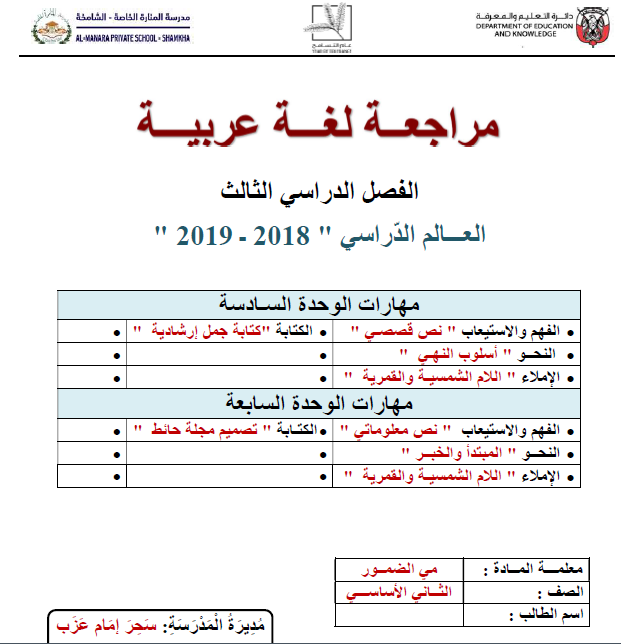 اوراق عمل مراجعة لمادة اللغة العربية المتكاملة للصف الثاني الفصل الثالث