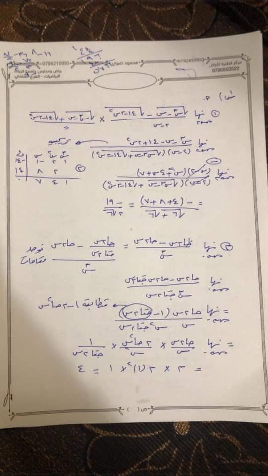 التوجيهي:بالصور نموذج امتحان الرياضيات الفرع العلمي الثانوية العامة توجيهي مع الحلول