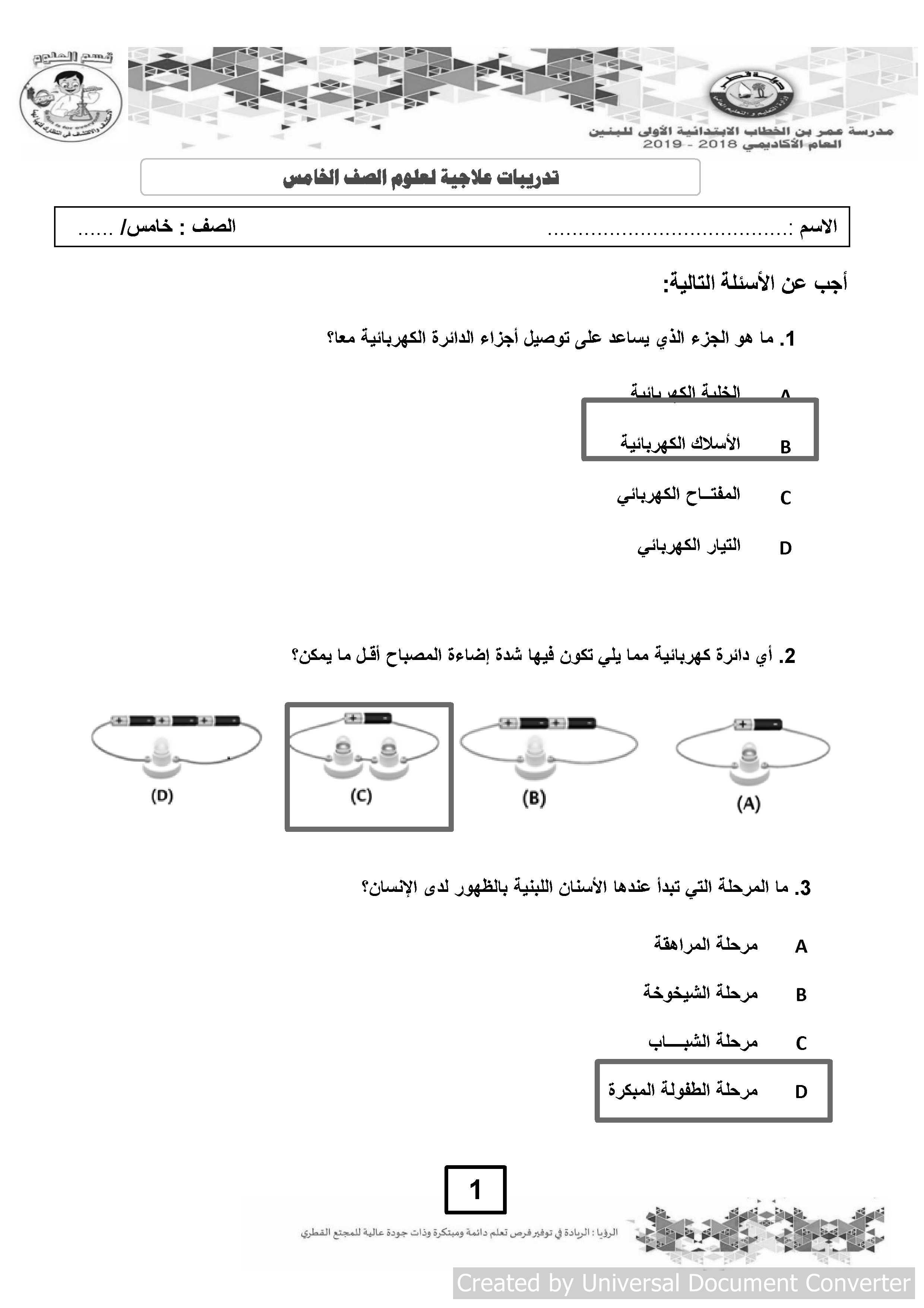 المنهاج القطري :تدريبات علاجية لمادة العلوم للصف الخامس الفصل الثاني