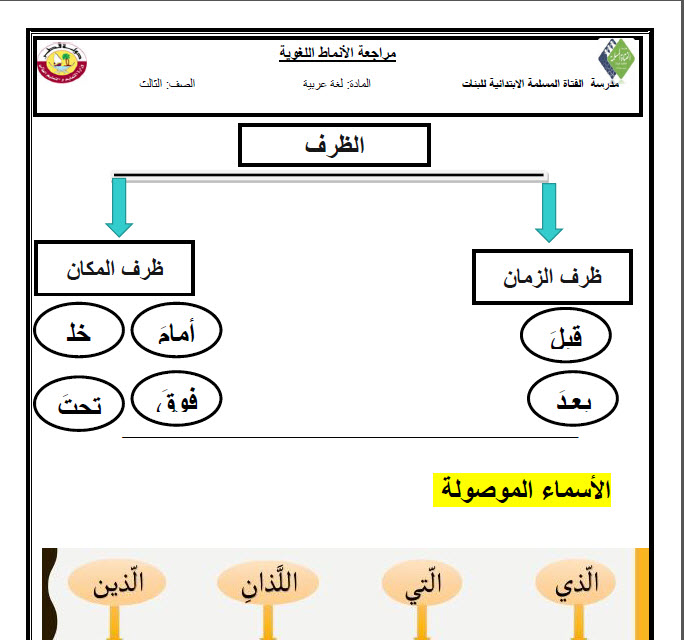 مراجعة الانماط اللغوية لمادة اللغة العربية الصف الثالث الفصل الاول المنهاج القطري
