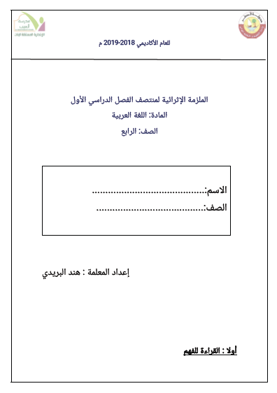 ملزمة اثرائية اوراق عمل لمادة اللغة العربية الصف الرابع الفصل الاول المنهاج القطري