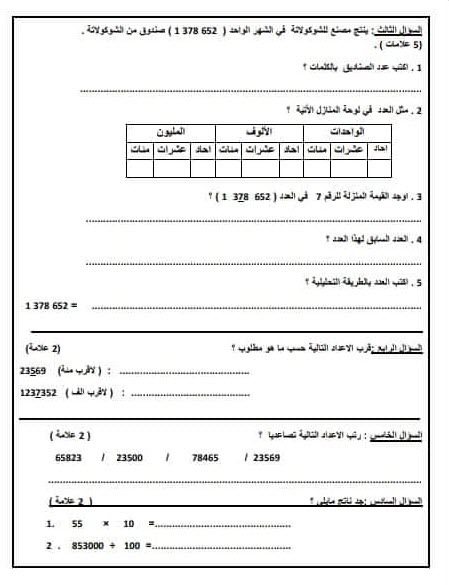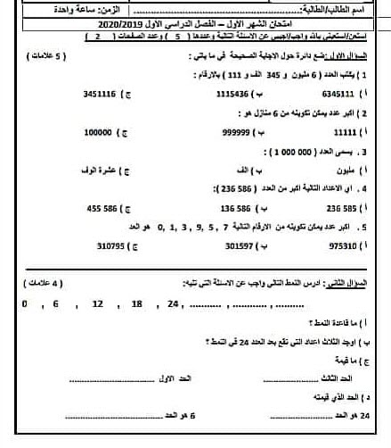 بالصور اختبار الشهر الاول لمادة الرياضيات الصف الرابع الفصل الاول