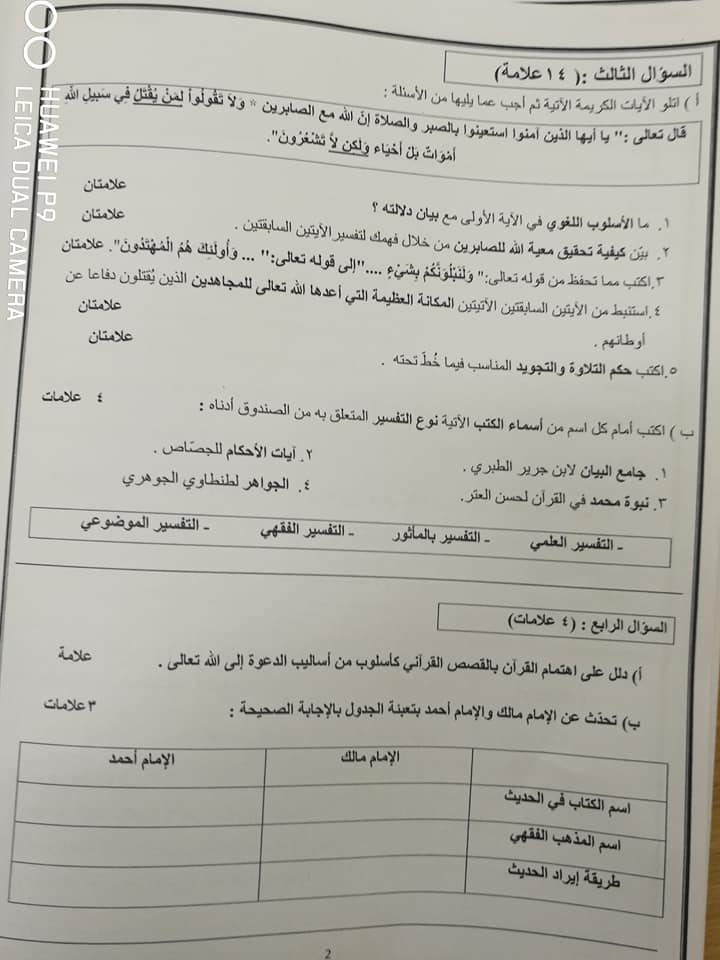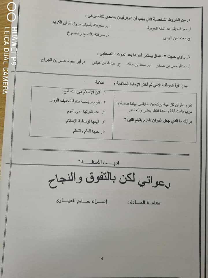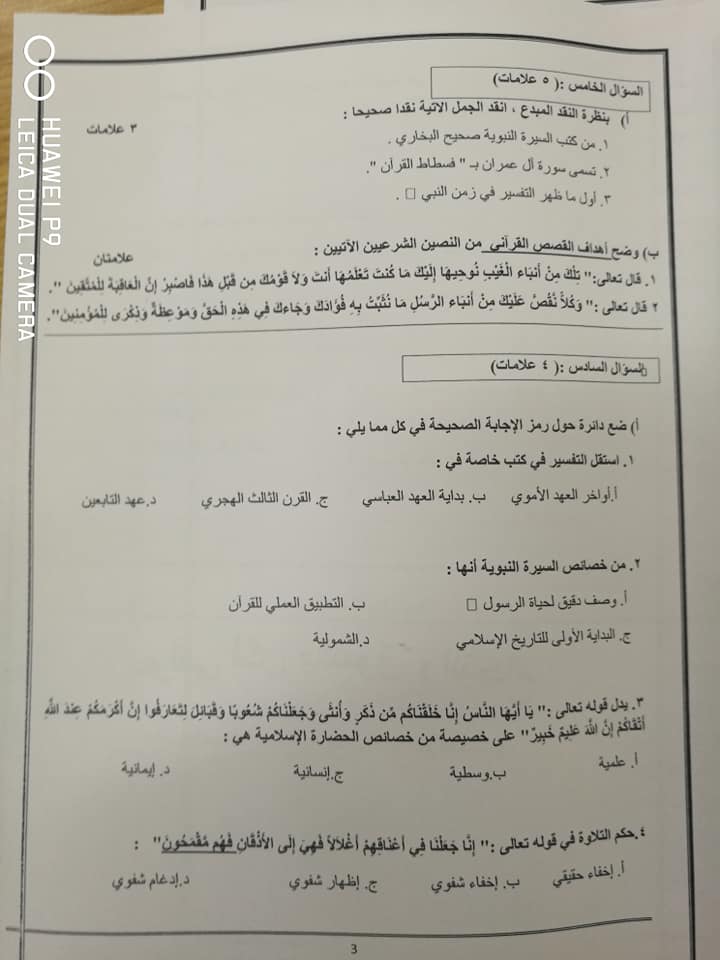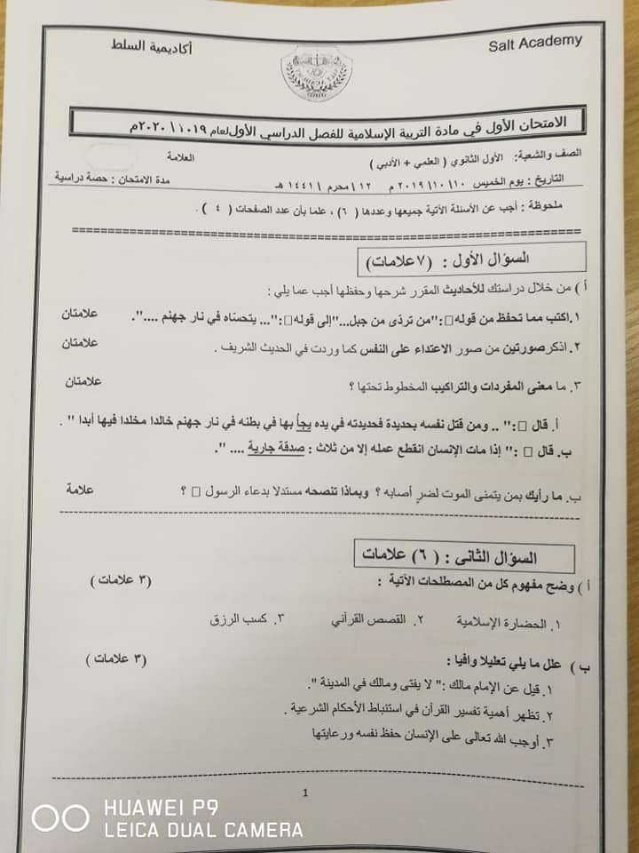 نموذج لامتحان الشهر الأول في مادة التربية الإسلامية للصف الأول الثانوي جميع الفروع الفصل الأول
