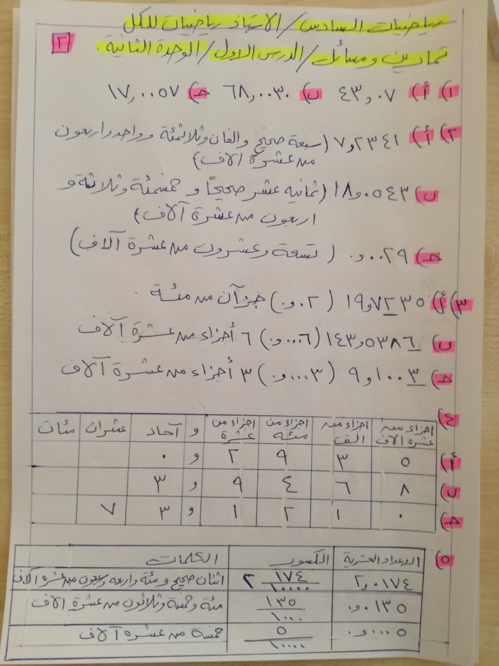حل المسائل و التمارين: الوحدة الثانية الدرس الأول الأجزاء من عشرة آلاف لمادة الرياضيات للصف السادس ا