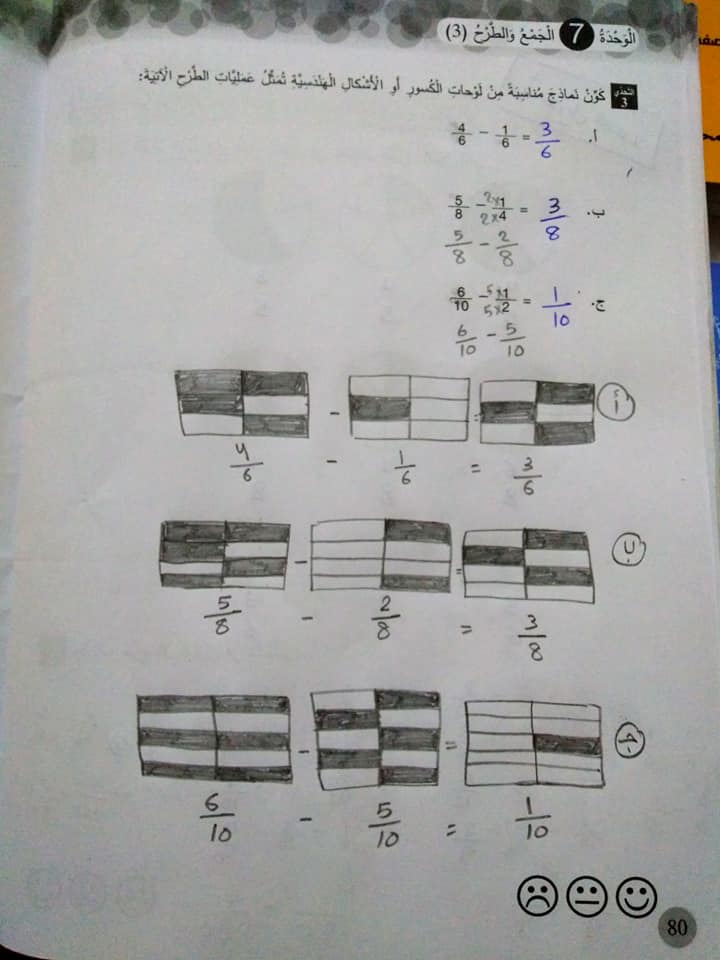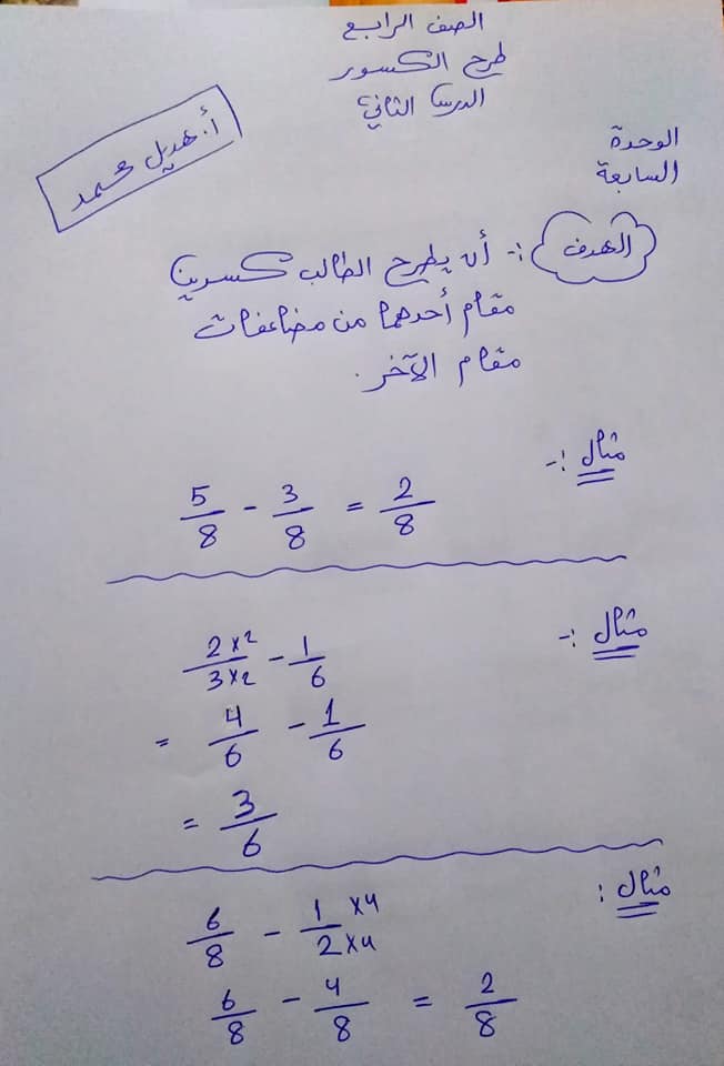 الوحدة السابعة:شرح | الدرس الثاني| طرح_الكسور لمادة الرياضيات الصف الرابع الفصل الاول الطبعة الجديدة