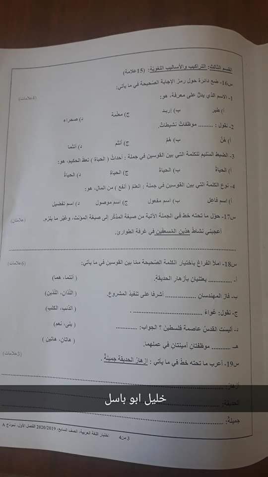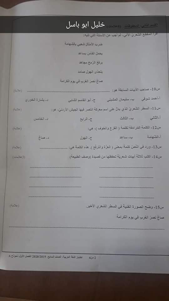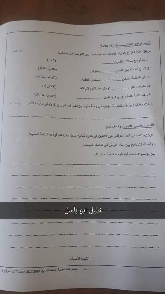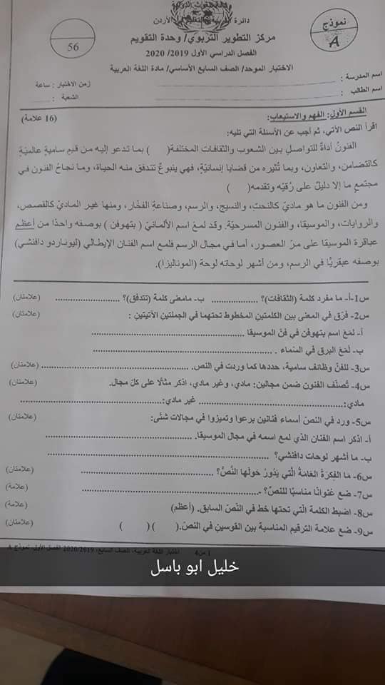 الوكالة :نموذج للاختبار النهائي لمادة اللغة العربية للصف السابع الفصل الأول
