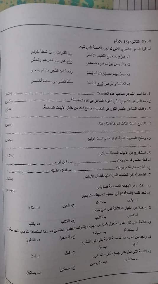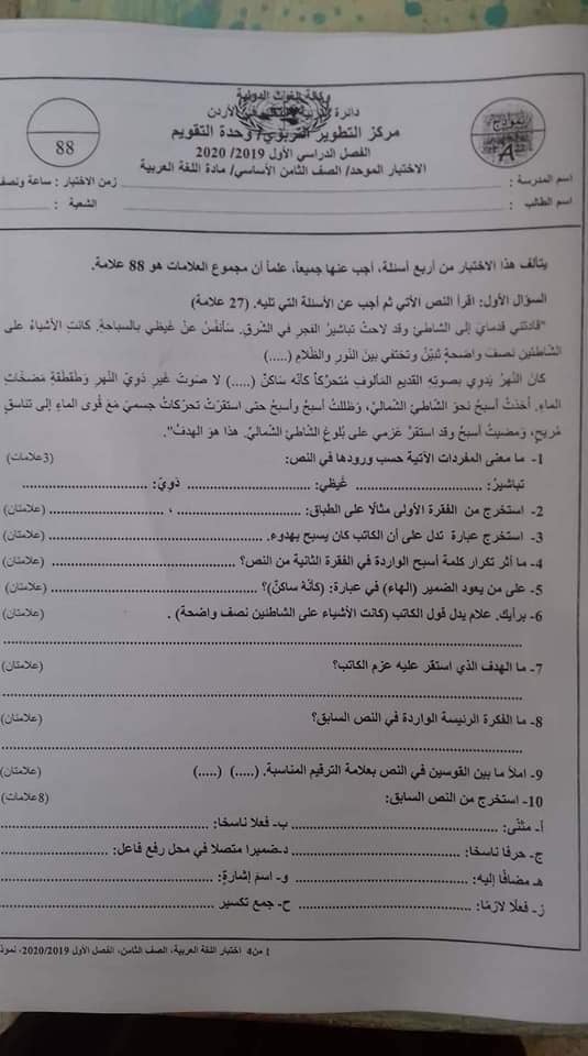 مصورة :. الوكالة :نموذج للاختبار النهائي لمادة اللغة العربية للصف الثامن الفصل الأول