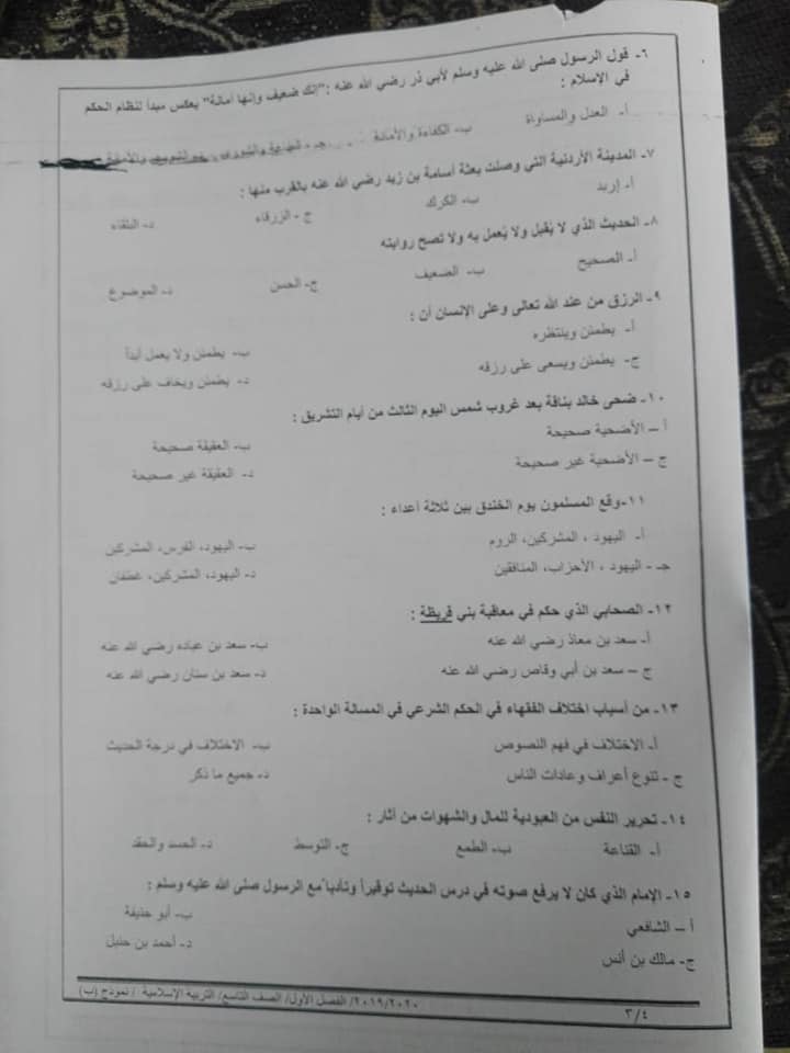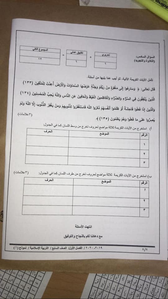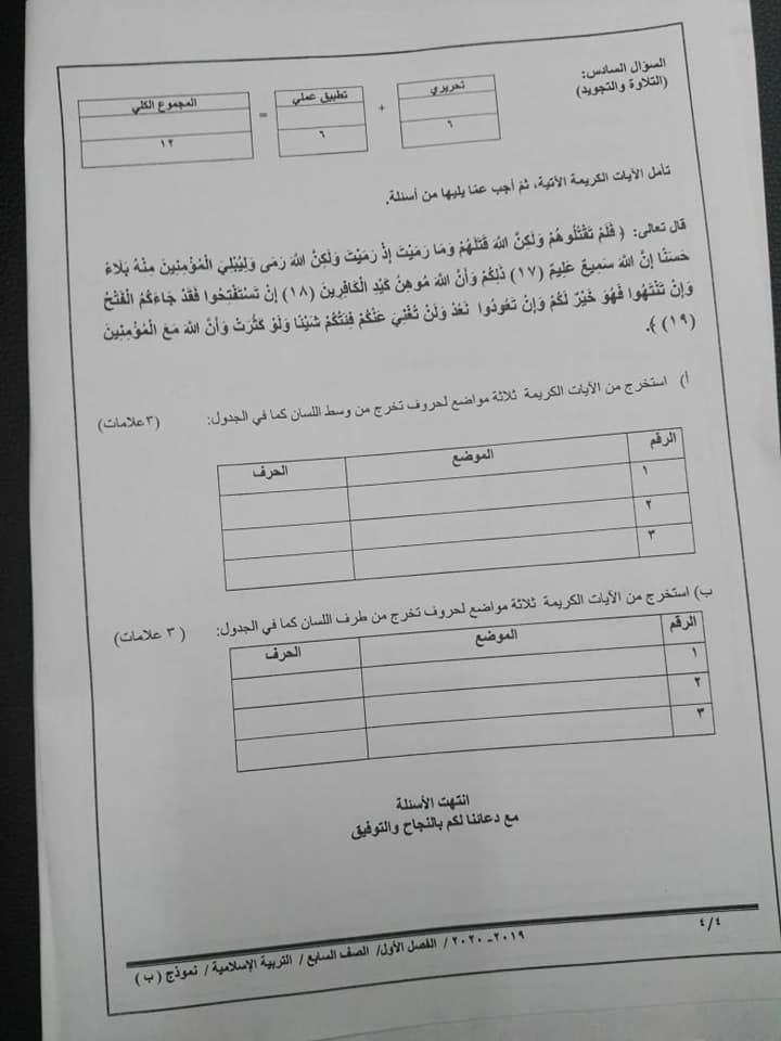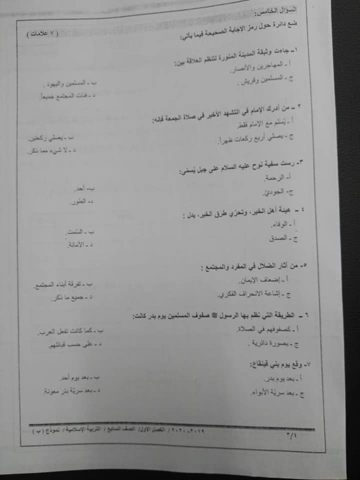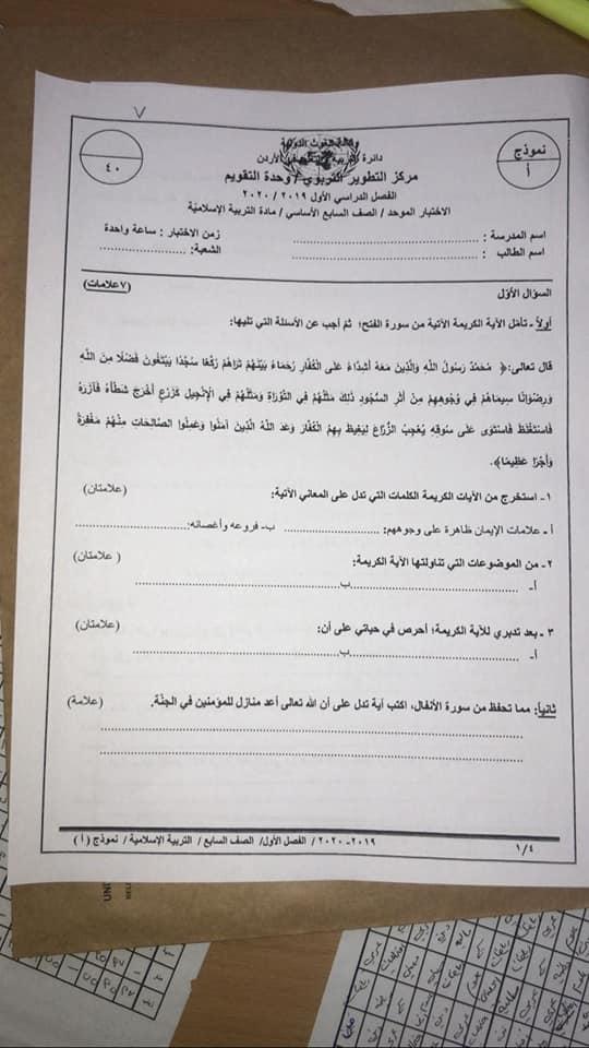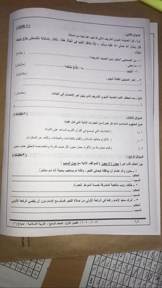 الوكالة A-B :نموذج للاختبار النهائي لمادة التربية الإسلامية للصف السابع الفصل الأول -