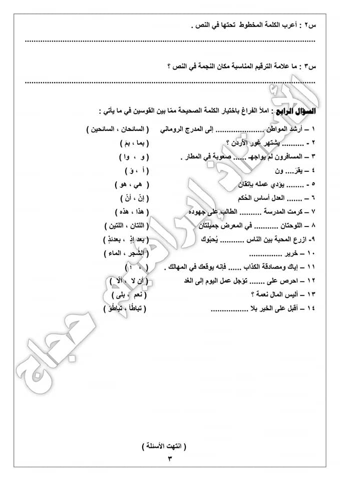 نموذج للاختبار النهائي لمادة اللغة العربية للصف السابع الفصل الأول