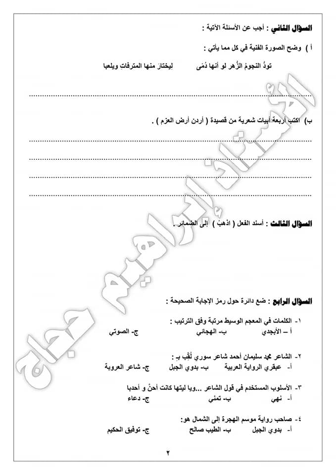 مصور :. نموذج للاختبار النهائي لمادة اللغة العربية للصف الثامن الفصل الأول
