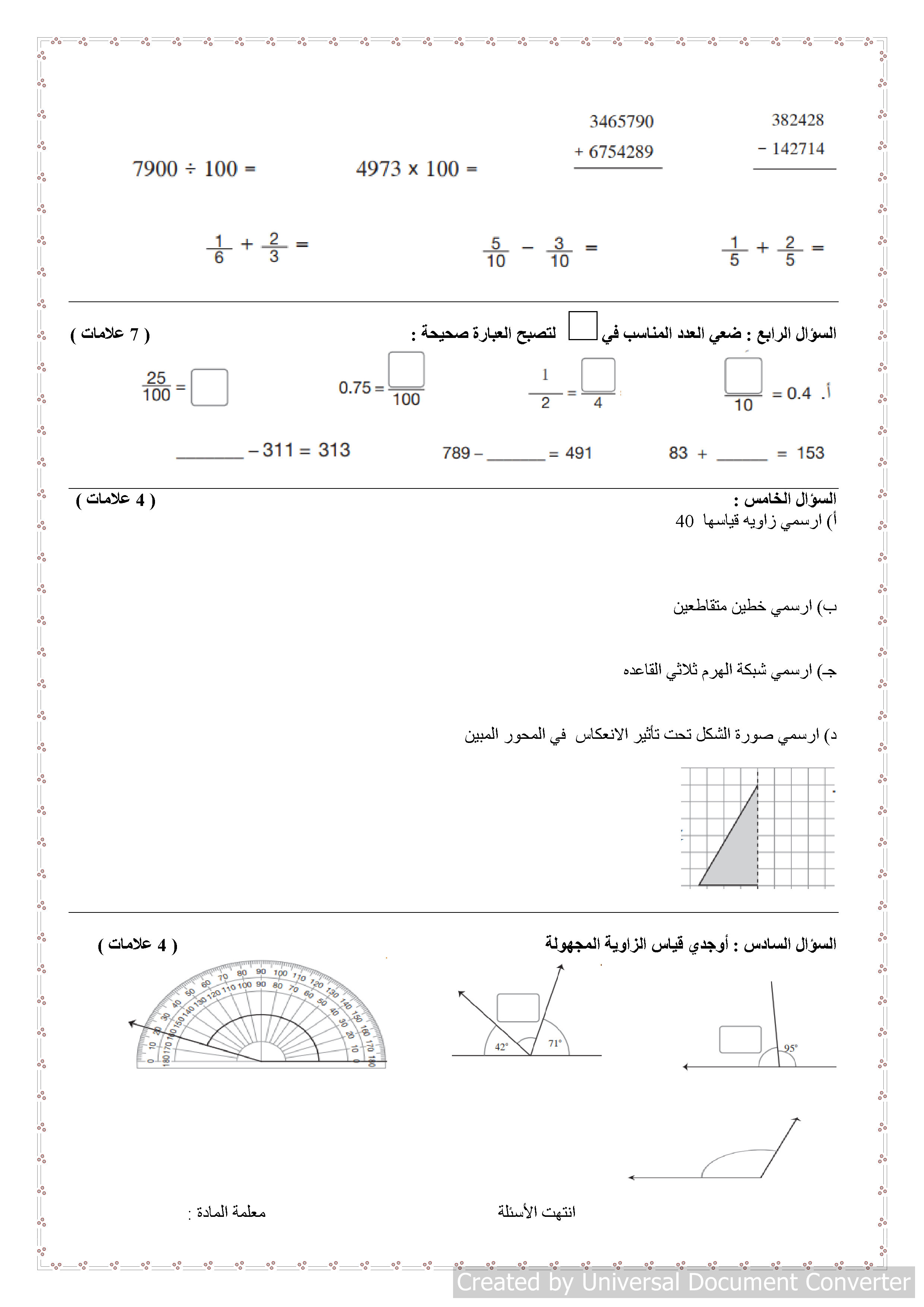 الاختبار النهائي لمادة الرياضيات للصف الرابع الفصل الأول نموذج 3
