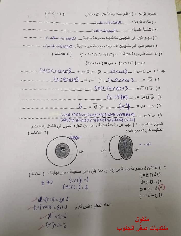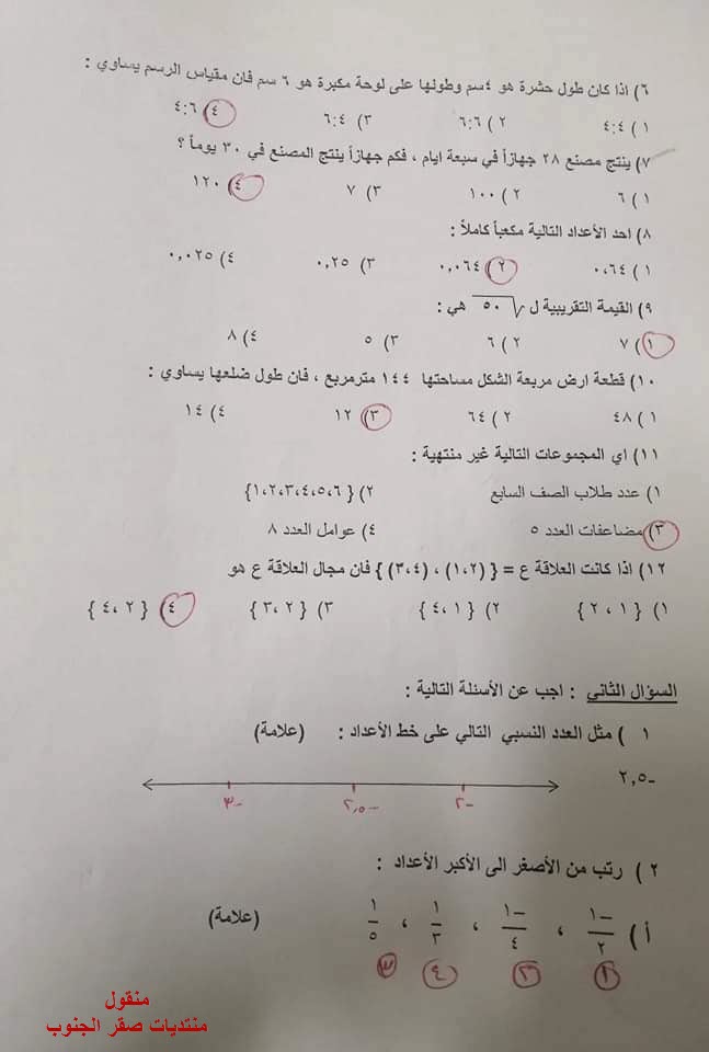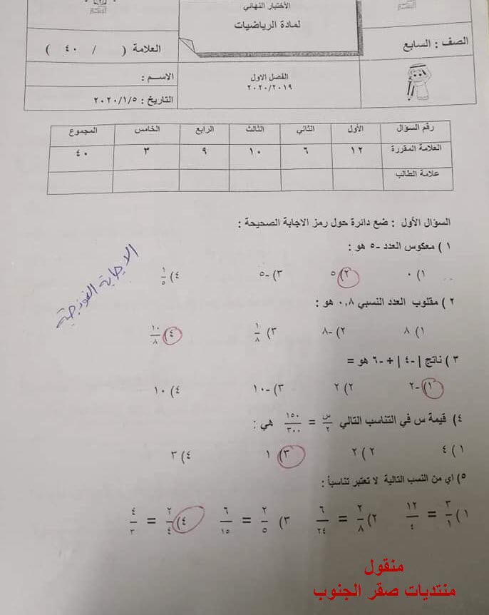 بالصور نموذج اختبار نهائي لمادة الرياضيات مع الاجابات للصف السابع الفصل الاول 2020