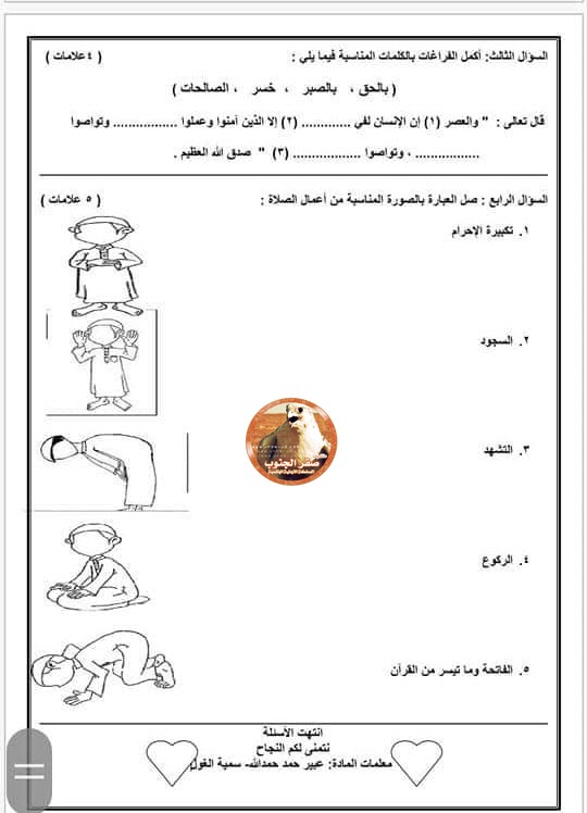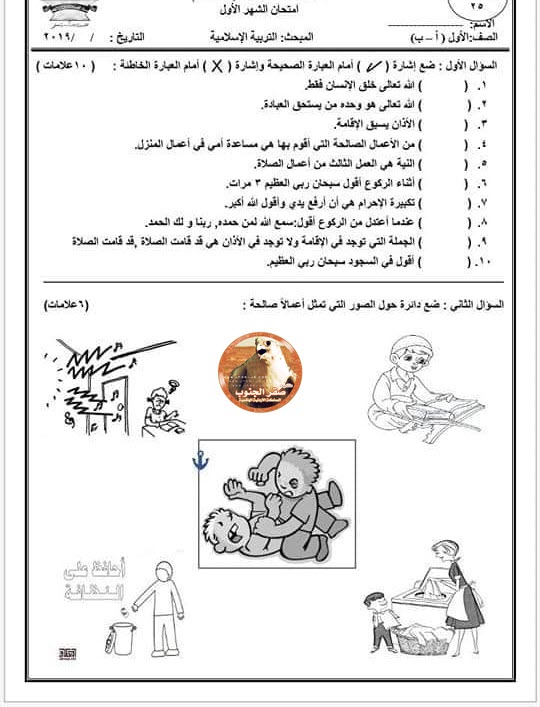 بالصور نموذجين اختبار للشهر الاول لمادة التربية الاسلاميةالفصل الثاني