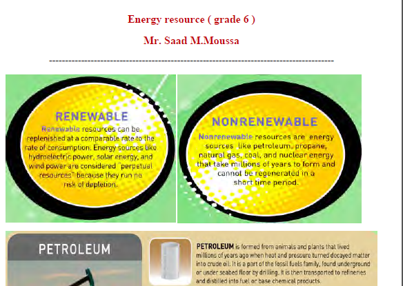 energy resources ملخص لمادة العلوم بالانجليزية للصف السادس الفصل الثاني