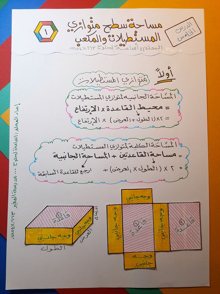 شرح الدرس الخامس: مساحة سطح متوازي المستطيلات والمكعب -الوحدة الخامسة لمادة الرياضيات للصف السادس