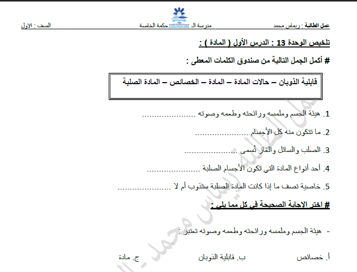 اوراق عمل مع الحل لمادة العلوم الصف الاول الفصل الثالث
