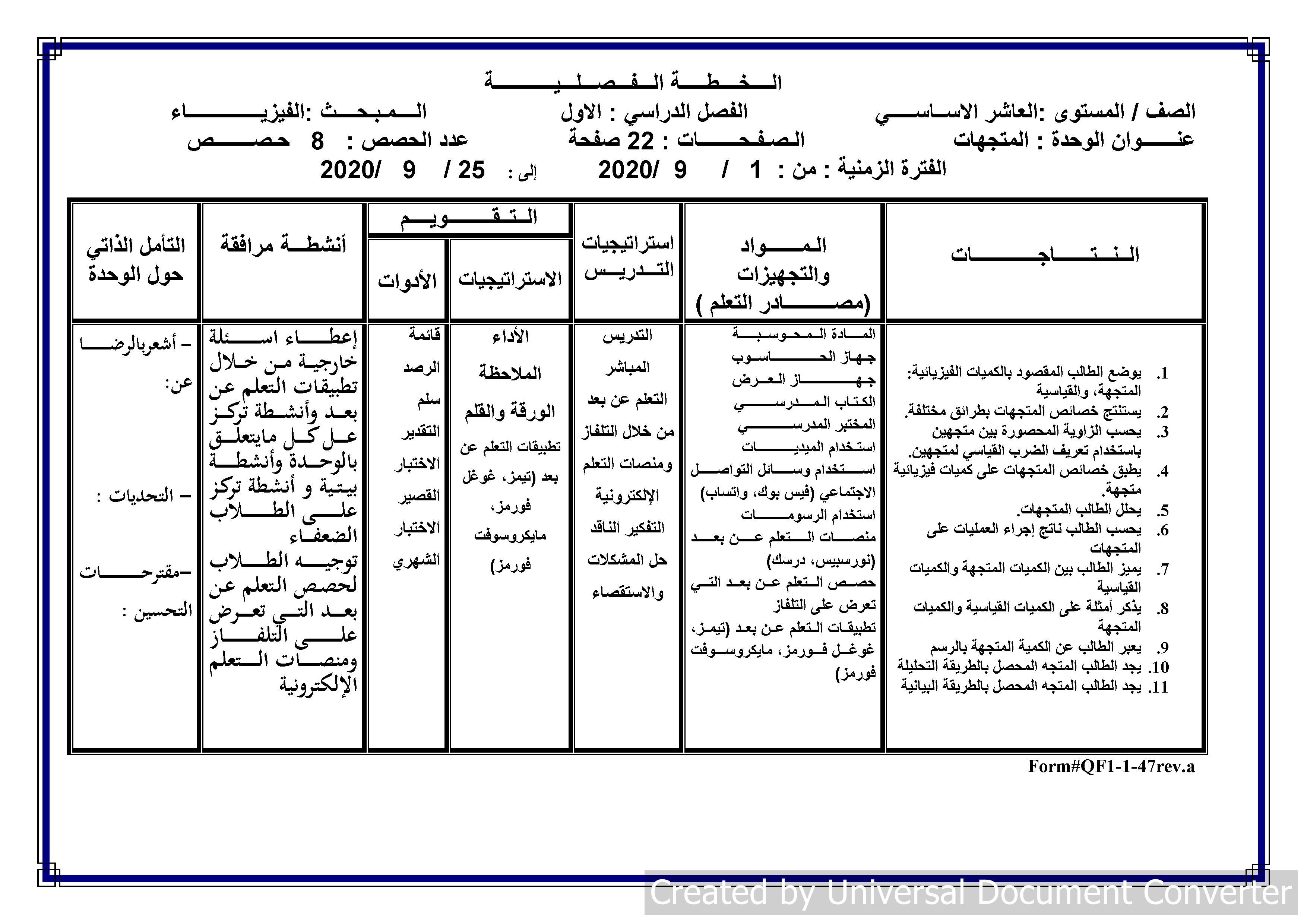الخطة الفصلية وتحليل محتوى الفيزياء للصف العاشر الفصل الاول