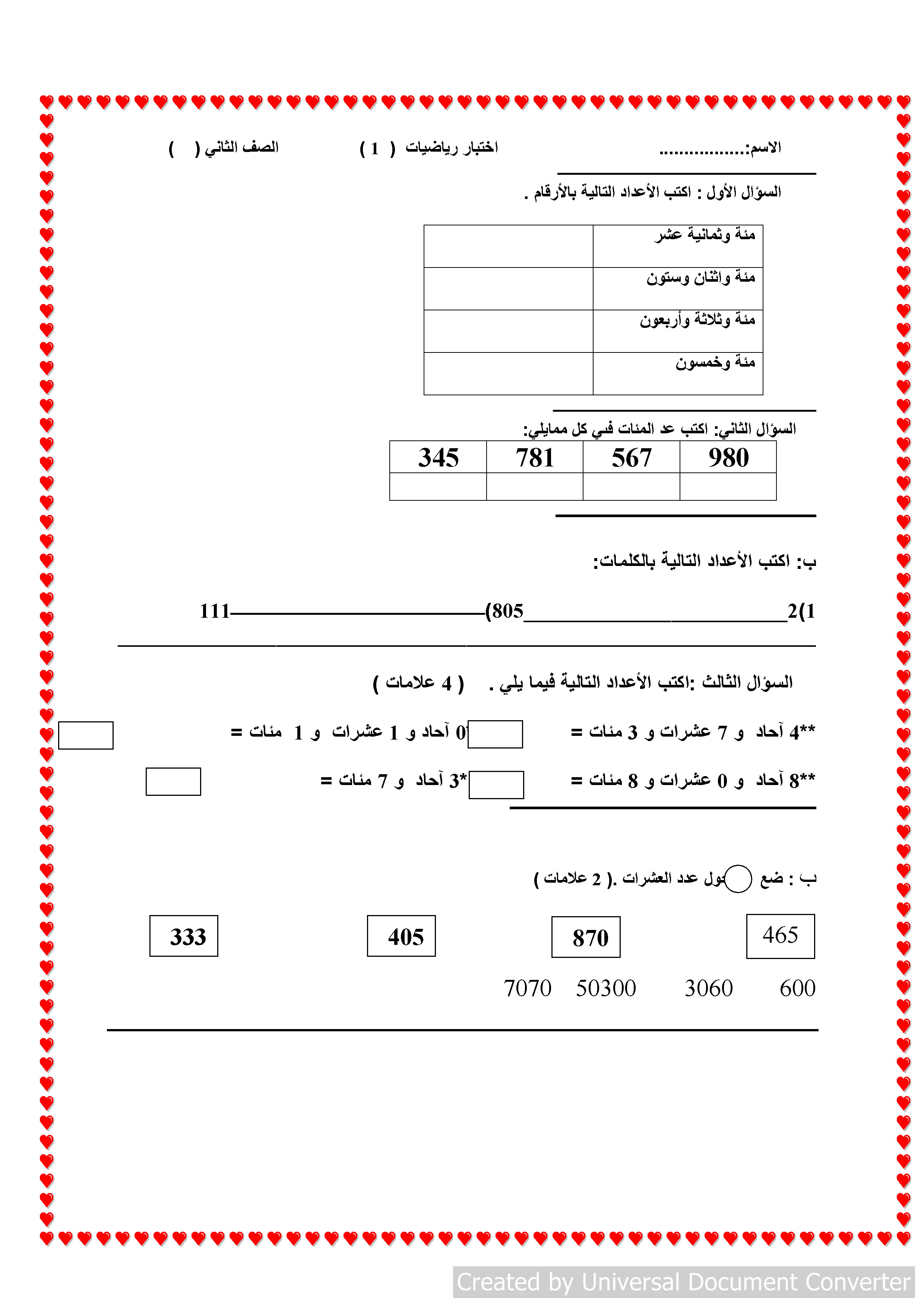 Word اختبار الشهر الاول لمادة الرياضيات collins مع الاجابات الصف الثاني الفصل الاول نموذج 1