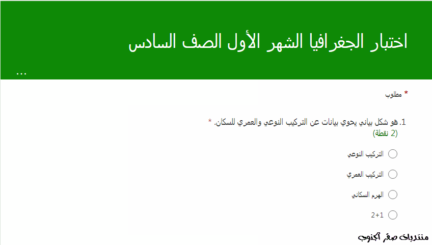 اختبار محوسب الشهر الاول لمادة الجغرافيا الصف السادس الفصل الثاني للدخول الى الاختبار من هنا أنقر للتوسيع...
