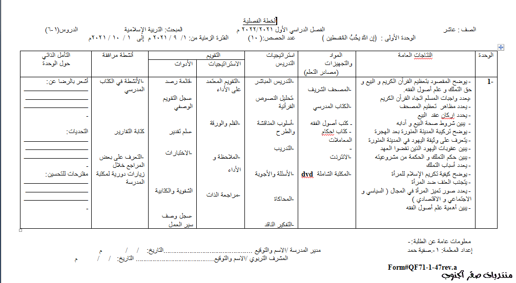 نموذج Word قابل للتعديل الخطة الفصلية وتحليل محتوى التربية الإسلامية للصف العاشر الفصل الأول