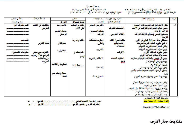 نموذج Word قابل للتعديل الخطة الفصلية وتحليل محتوى التربية الإسلامية للصف السابع الفصل الأول