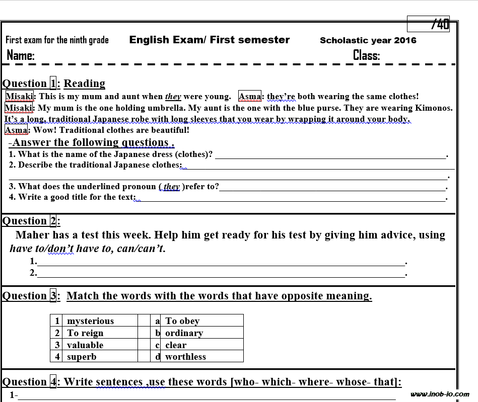 نموذج رقم - 6 - Word قابل للتعديل اختبار الشهر الأول لمادة اللغة الانجليزية Action Pack للصف التاسع الفصل الأول