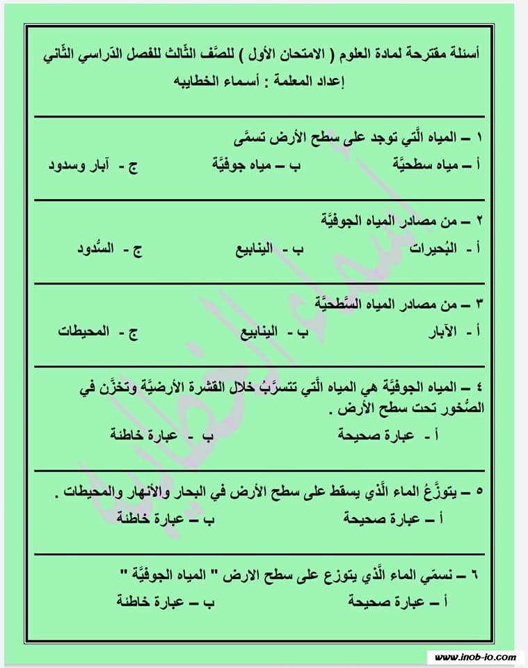 بالصور أسئلة مقترحة الامتحان الأول لمادة العلوم للصف الثالث الفصل الاول