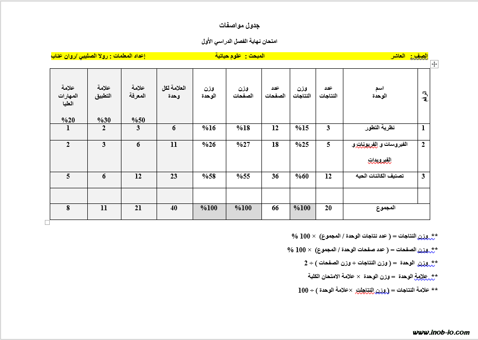 نموذج Word قابل للتعديل جدول مواصفات لمادة العلوم للصف العاشر الفصل الاول 2021
