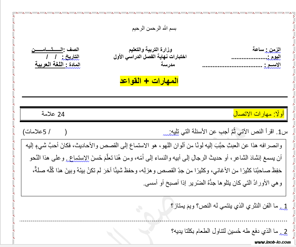 نموذج -3- Word قابل للتعديل الاختبار النهائي لمادة اللغة العربية الصف الثامن الفصل الاول
