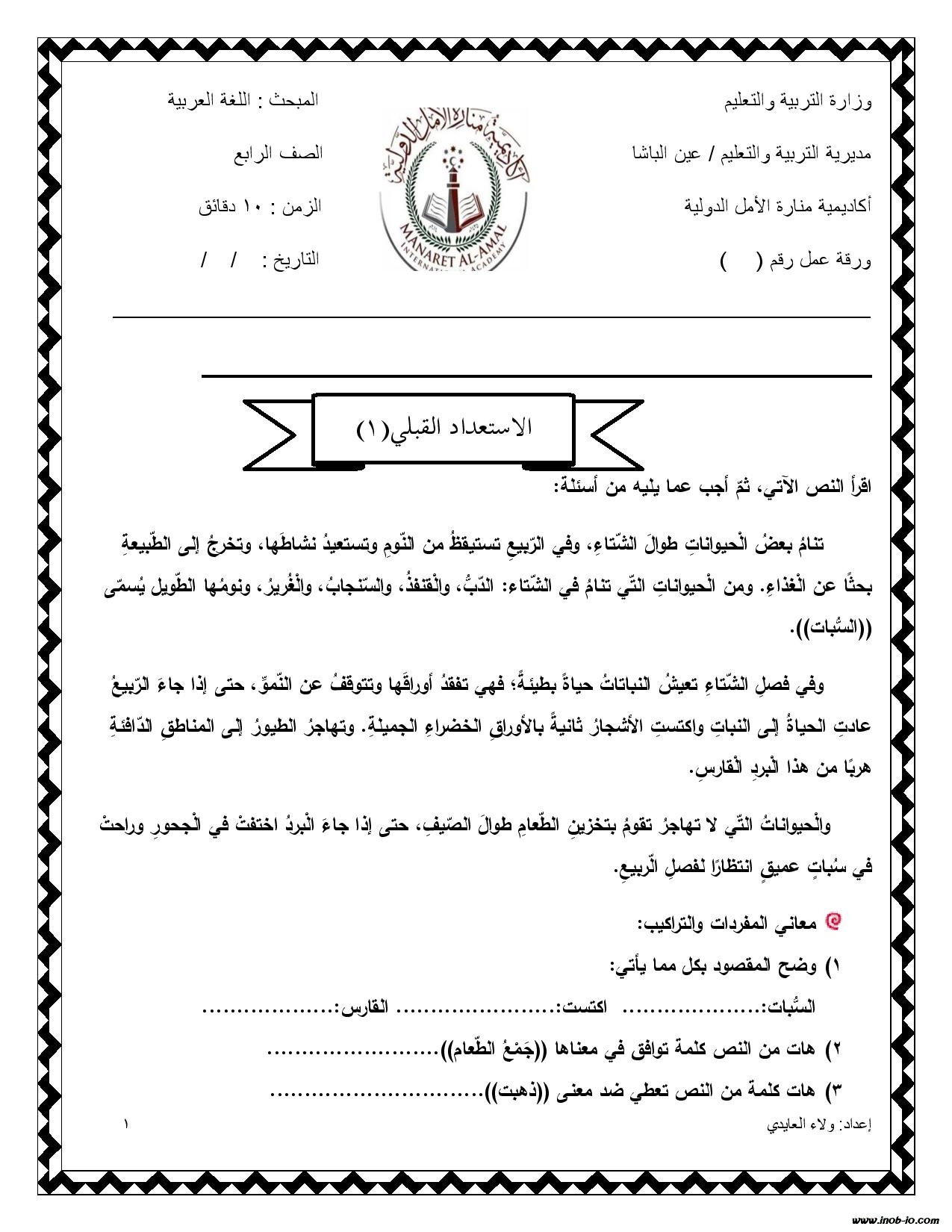 مجموعة اوراق عمل لمادة اللغة العربية الصف الرابع الفصل الثاني