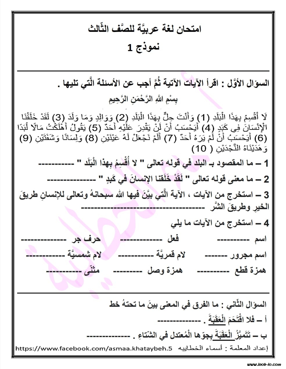 بالصور نموذجين من امتحان اللغة العربية للصَّف الثالث بأول درسين الفصل الثاني