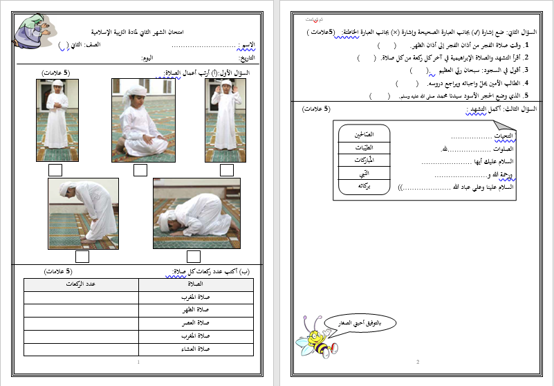 نموذج-2- Word اختبار الشهر الثاني لمادة التربية الاسلامية الصف الثاني الفصل الثاني
