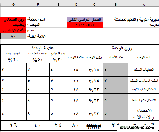 نموذج Excel قابل للتعديل جداول مواصفات لمادة الرياضيات الصف الثامن الفصل الثاني