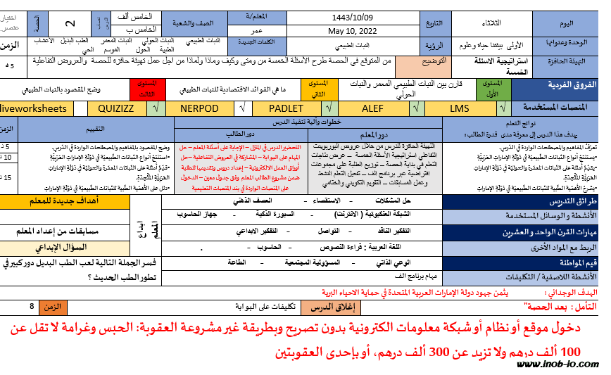 الخطة الدرسية اليومية النبات الطبيعي الدراسات الاجتماعية والتربية الوطنية الصف الخامس