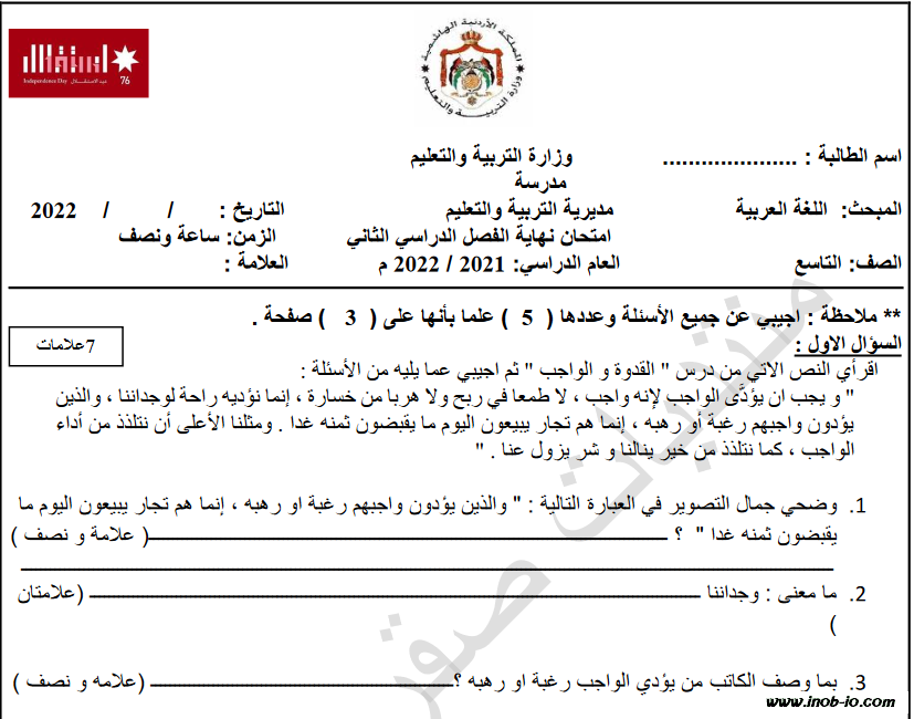 نموذج جديد :. الاختبار النهائي لمادة اللغة العربية الصف التاسع الفصل الثاني