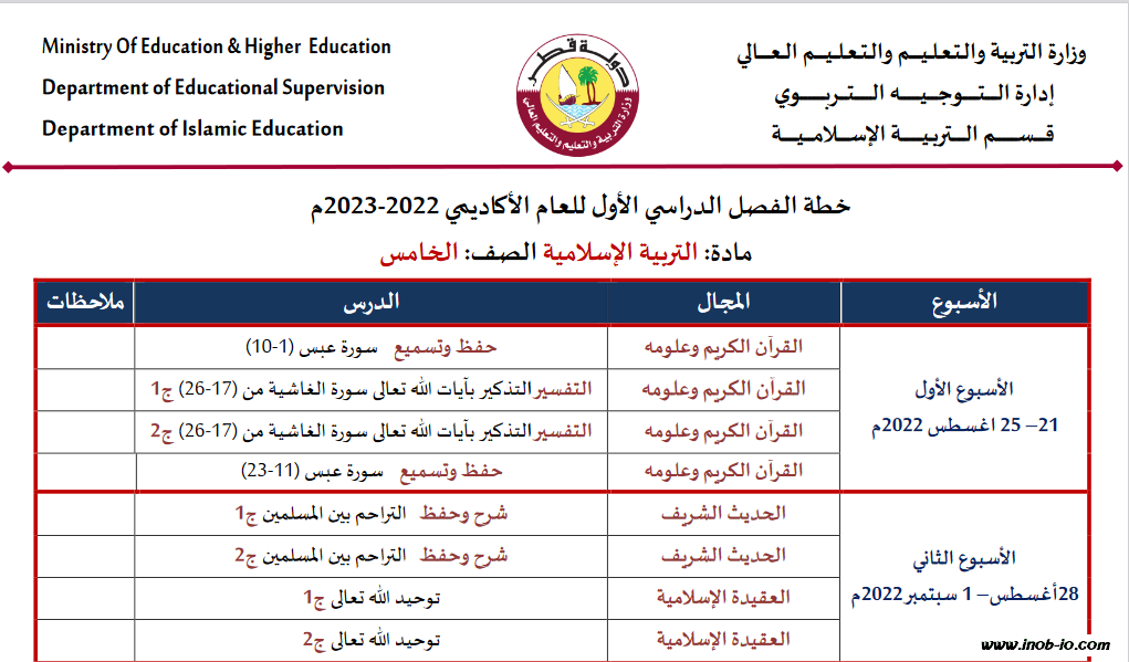الخطة الفصلية لمادة التربية الاسلامية الصف الخامس الفصل الاول المنهاج القطري 2023-2022