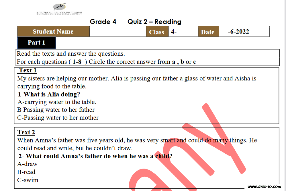 أوراق عمل و مراجعة للامتحان مادة اللغة الإنجليزية الصف الرابع الفصل الثالث