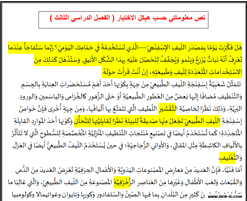حل النص المعلوماتي الليف الإسفنجي حسب الهيكل لمادة اللغة العربية الصف الخامس الفصل الثالث