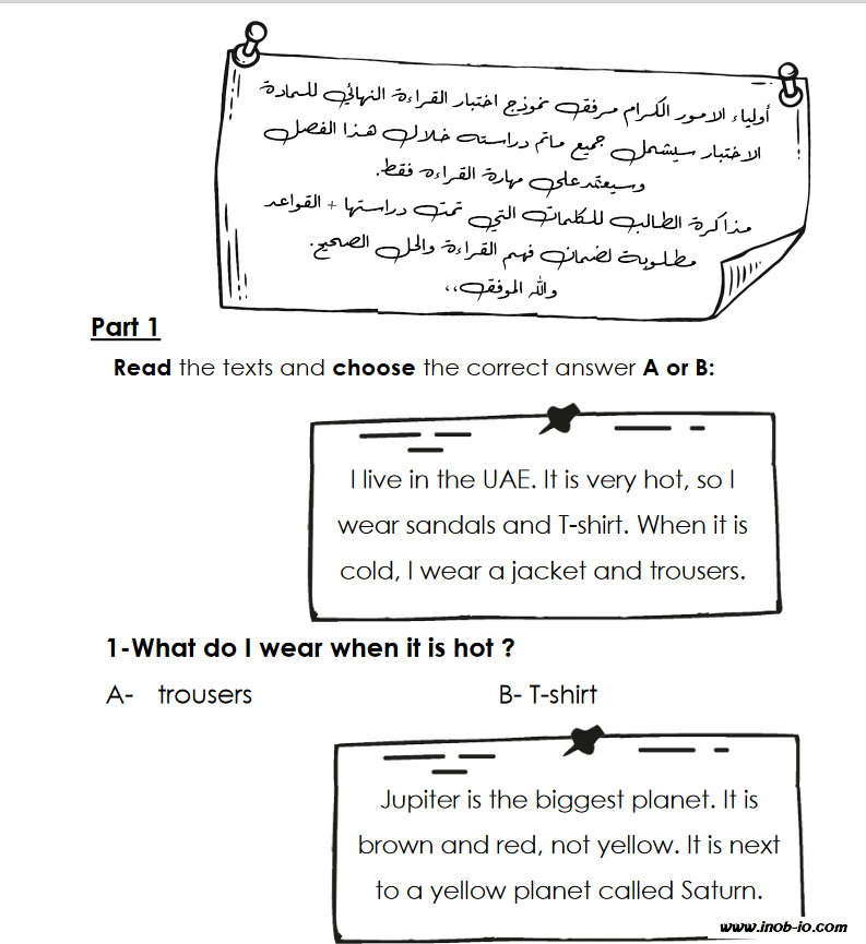 أوراق عمل Reading Test لمادة اللغة الإنجليزية الصف الخامس الفصل الثالث