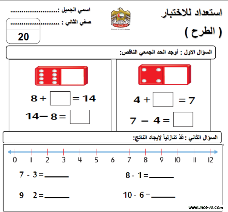 نموذج اختبار عن الطرح لمادة الرياضيات المتكاملة الصف الثاني الفصل الاول